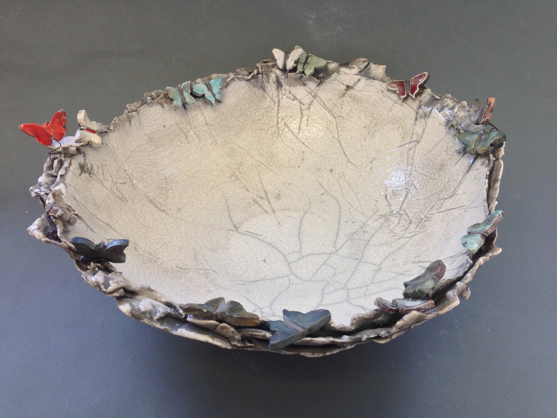 16"d x 4"h raku fired bowl, butterflies attached with wire